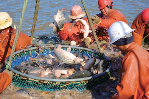 随着2026年元旦临近,水产市场需求量逐渐增大,江苏省连云港市海州区积极做好鲜鱼捕捞销售工作,切实满足节日市场需求。图为海州区的江苏yp电子岗埠农场加紧拉网捕捞鲤鱼、花鲢、白鲢等各种鲜鱼,准备供应云南昆明、山东济宁等多地市场。 徐卫 摄